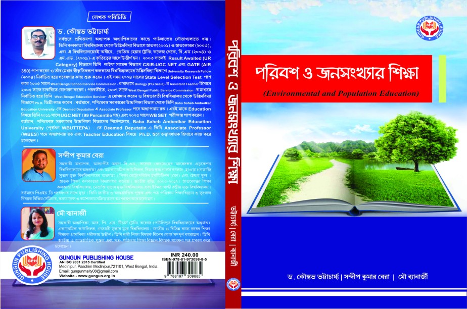 Poribesh o Jonosankha (Environmental and Population Education) B.Ed. 4th SEMESTER COURSE - XI (1.4.11) AUTHORS: Dr. Kaustuv Bhattacharyya & Sandip Kumar Bera, Mou Banerjee , Publisher: Gungun Publishing House ISBN : 978-81-973098-8-5 Price: 240.00 No. of Pages: 188