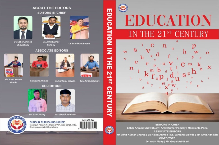 Edited book : EDUCATION IN THE 21ST CENTURY EDITOR-IN-CHIEF Dr. Saber Ahmed Chowdhury | Dr. Amit kumar Pandey |Dr. Manikanta Paria ASSOCIATE EDITORS Mr. Amit Kumar Bhunia | Sk Najim Ahmed | Dr. Santanu Biswas | CO-EDITORS Dr. Arun Maity | FOREWORD PROF (DR) JAYANTI DAS DEPARTMENT OF EDUCATION, UNIVERSITY OF CALCUTTA Message Professor (Dr.) Asis Kumar Dandapat Principal Hijli College, Kharagpur,Paschim Medinipur,West Bengal, India GUNGUN PUBLISHING HOUSE ISBN: 978-81-959134-4-2 No. of Pages: 236 Price: 300/- Email id: gungunmaity08@gmail.com Contact: 9647222836