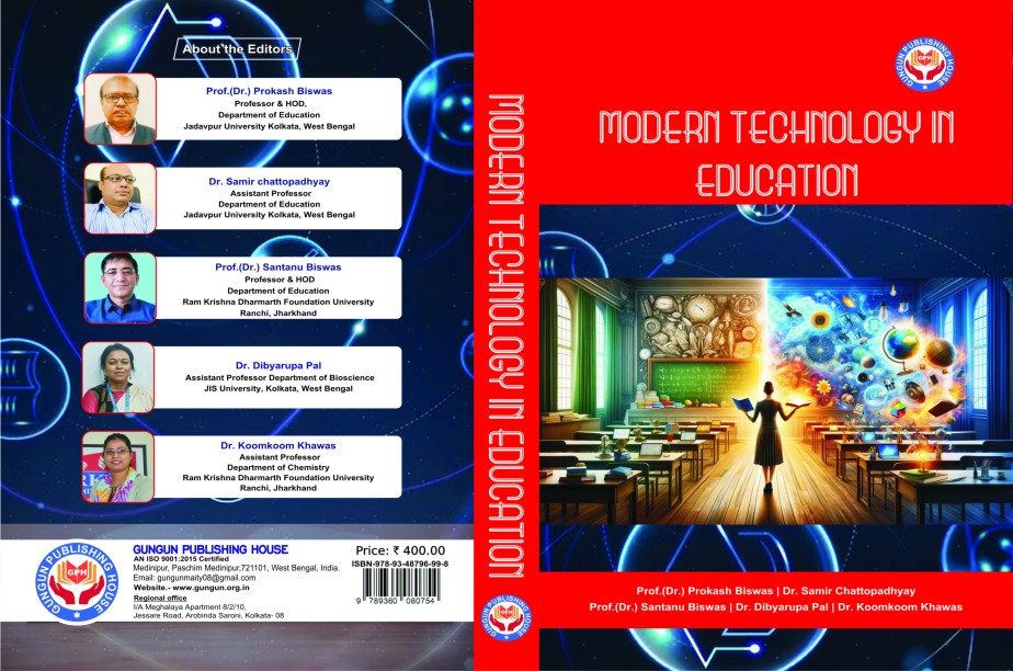 Modern Technology in Education Language: English EDITORS: Prof.(Dr.) Prokash Biswas , Dr. Samir Chattopadhyay Prof.(Dr.) Santanu Biswas , Dr. Dibyarupa Pal Dr. Koomkoom Khawas ISBN: 978-93-48796-99-8 Price: 500 No. of Pages: 282 Gungun Publishing House Phone Number : +91 9647222836 Website : www.gungun.org.in